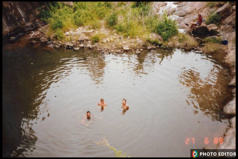 Angelica, Katherine and Ule swimming at the waterfall.